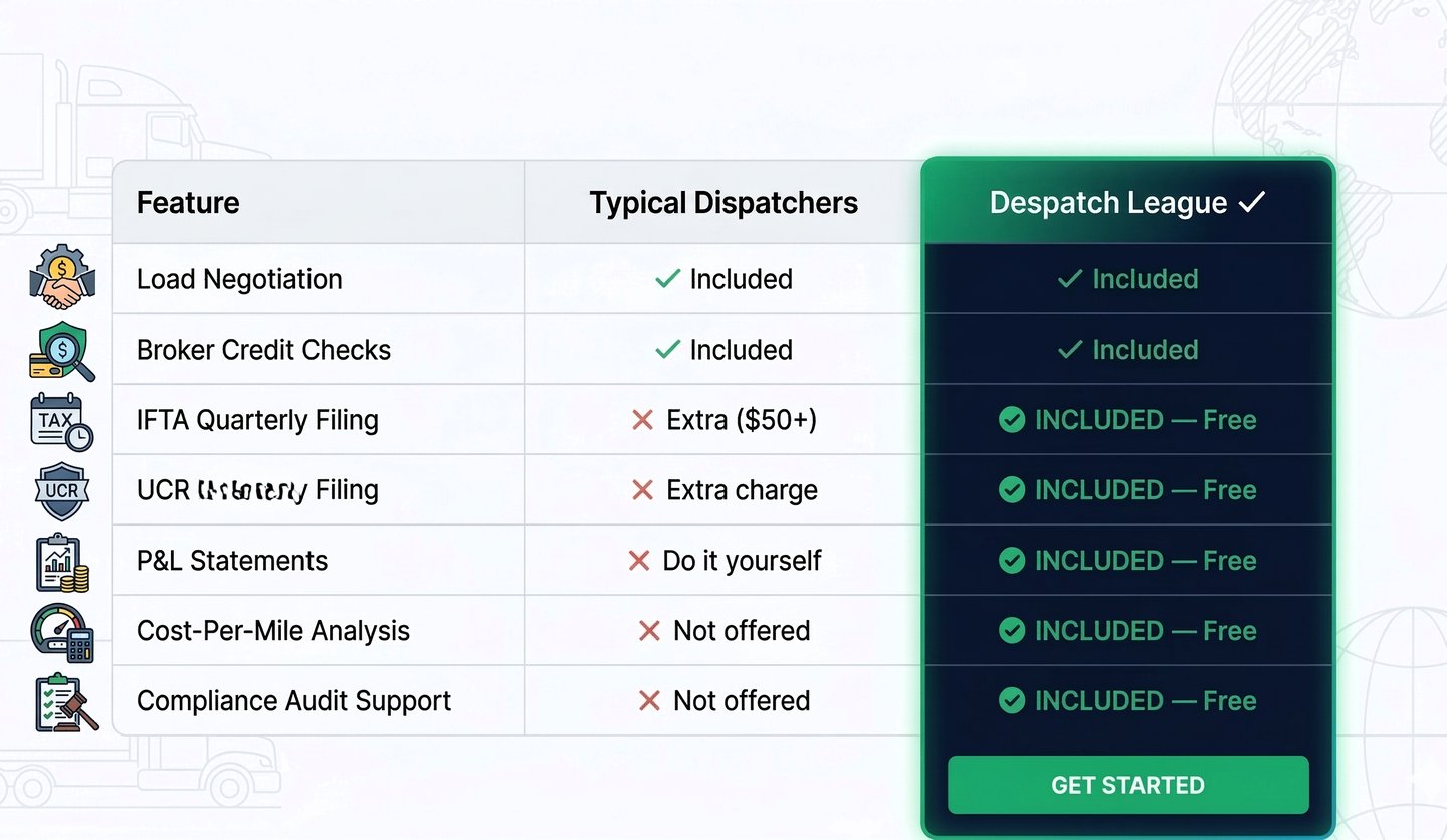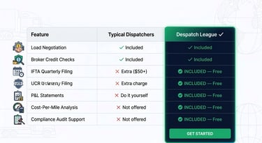 We don't clip a percentage of a load and move on. Our flat-fee model means we only win when you do — when you're profitable, compliant, and growing.